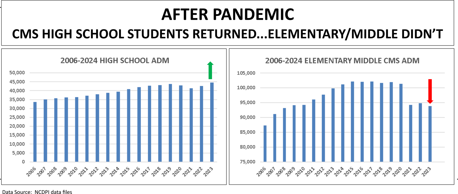 The pandemic disrupted student development and learning. It also broke some families' relationships with the traditional public schools. In the charts below, every CMS K-8 grade lost students enrollment. Three years post-Covid, K-8 enrollment dropped below the 2010 ADM.
