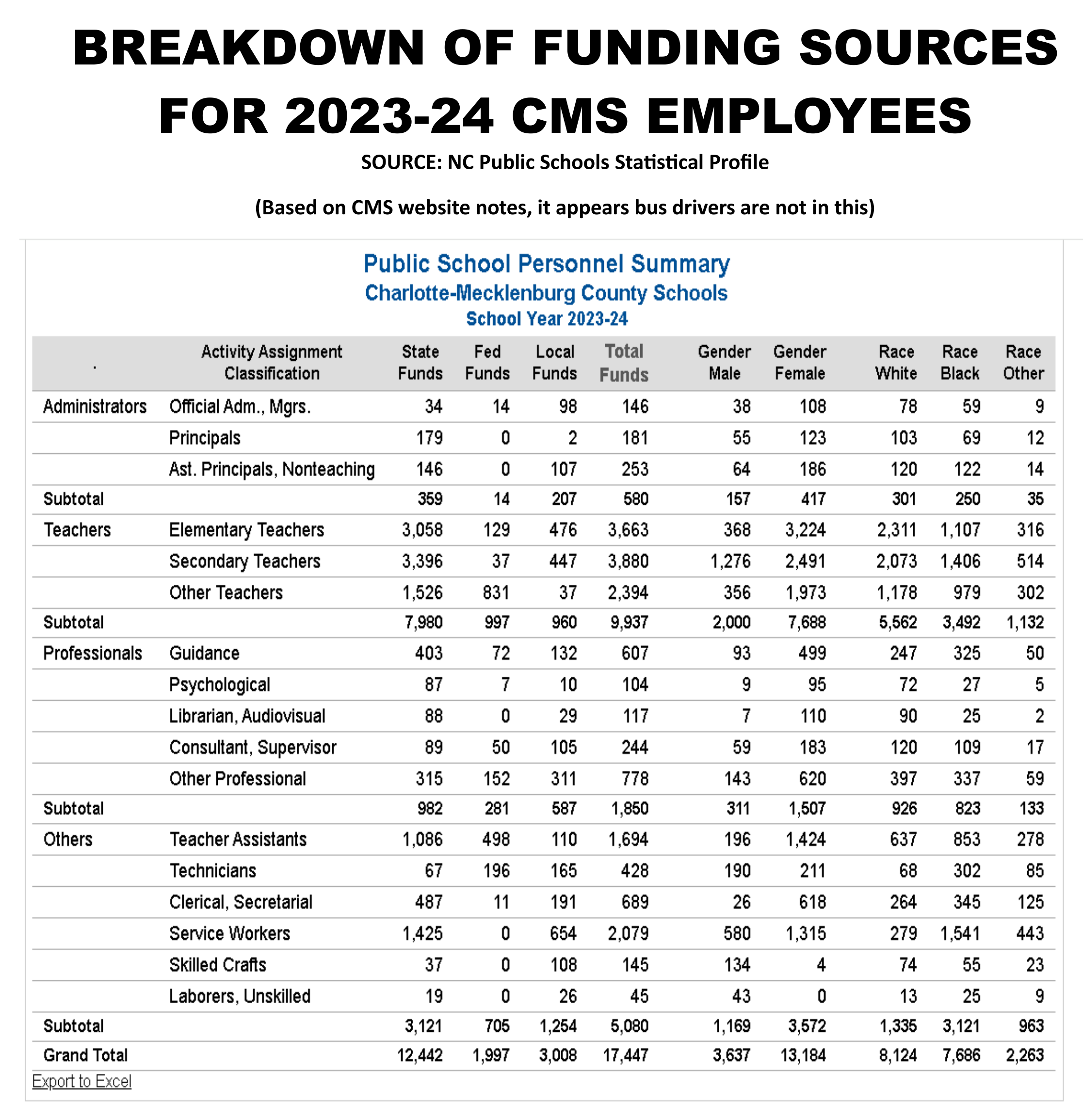 The North Carolina General Assembly allocates to each school district specific teaching positions.  If all the rules are followed, a school superintendent couldn’t hire a math teacher into a French class position and then teach math.  However, there is some flexibility for districts to plead their cases to “swap” positions.   If she can’t manipulate the system, she may still find money from another source.  The Charlotte-Mecklenburg Funding chart below shows what this looks like.